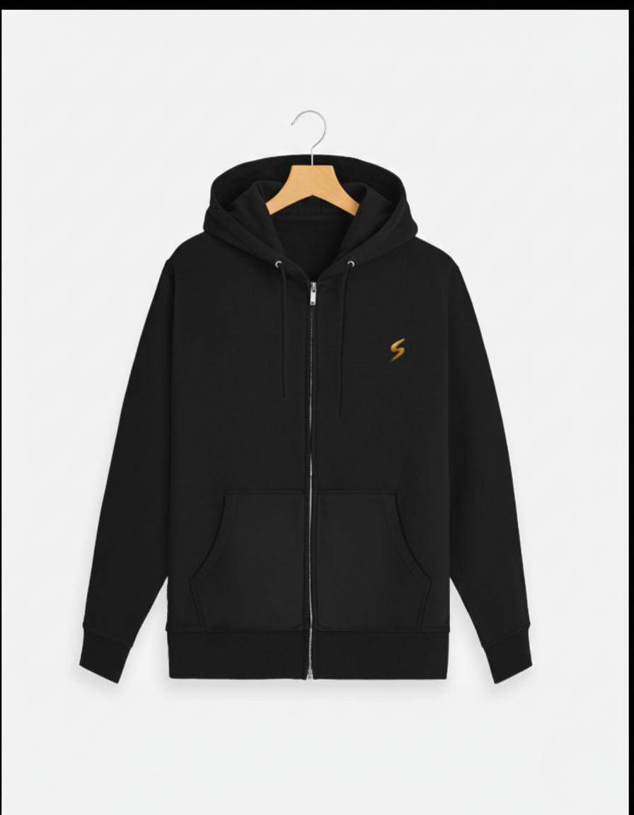 The sleek black color, paired with the gold embroidered chest logo, gives it a refined minimal look that fits effortlessly with any outfit. Finished with metal-tipped drawstrings, a smooth zipper, and front pockets, this hoodie is made to elevate your wardrobe with comfort and confidence.